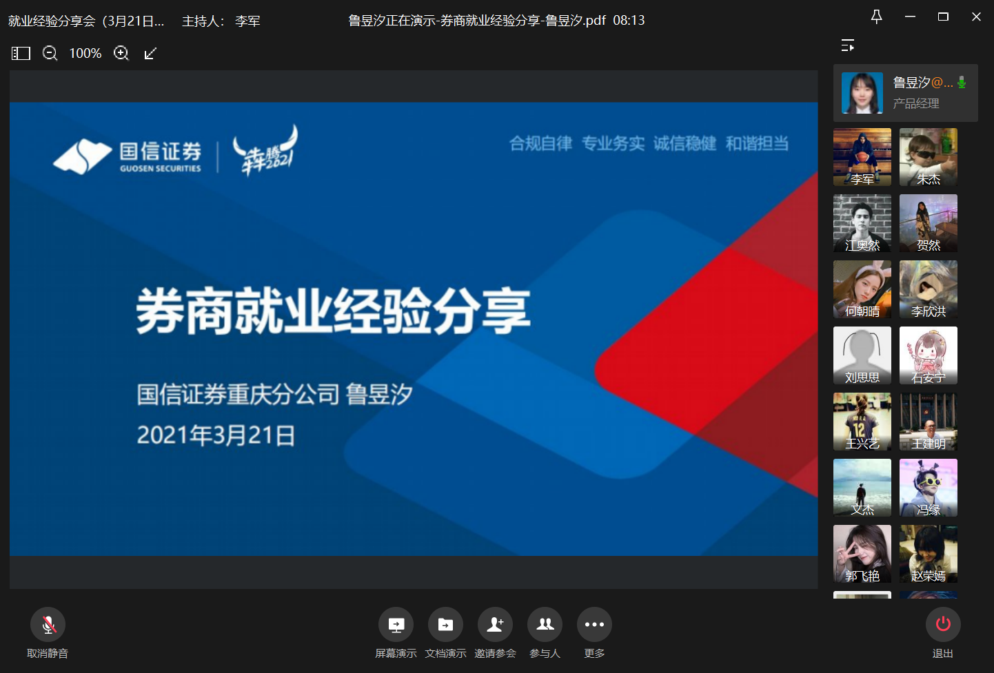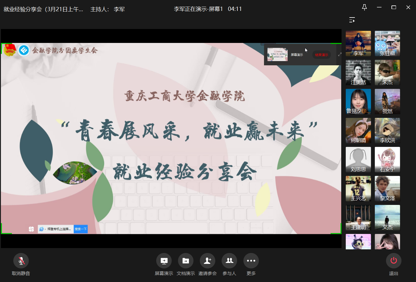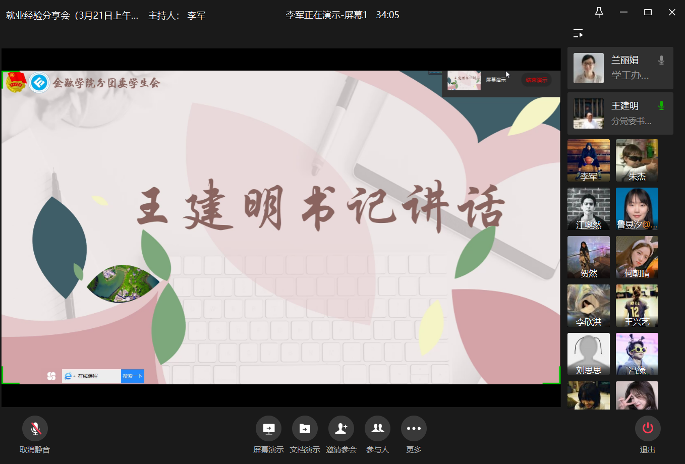 3月21日上午10:00,菲律宾欧博游戏网就业经验分享会于企业微信成功举办。本次活动邀请到国信证券股份有限公司的12级CFA专业鲁昱汐、广发银行股份有限公司的16级金融五朱杰、德勤华庆商务服务有限公司的16级投资二冷小兰、中汇国际保险经纪公司的16级保险一文思力进行就业经验分享。菲律宾欧博游戏网党委书记、副院长王建明,菲律宾欧博游戏网党委副书记、纪委书记余新,以及菲律宾欧博游戏网一百多名同学参加了会议。