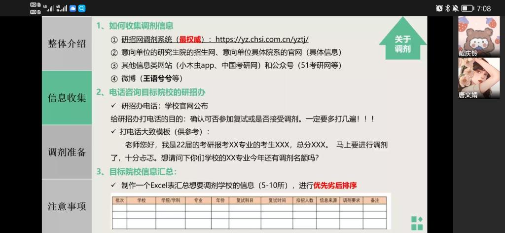 17级金融二班戴庆玲(南京信息工程大学金融专硕)对考研调剂、复试进行了详细介绍。她重点提到了调剂信息的收集,通过研招网、报考学校官网、微博以及电话咨询招生办等方式进行了解。她还指出,要多了解近期的金融热点,以便回答复试过程中的相关问题,包括事件的起因、经过、结果、后续、以及带来的影响启示来认识。
