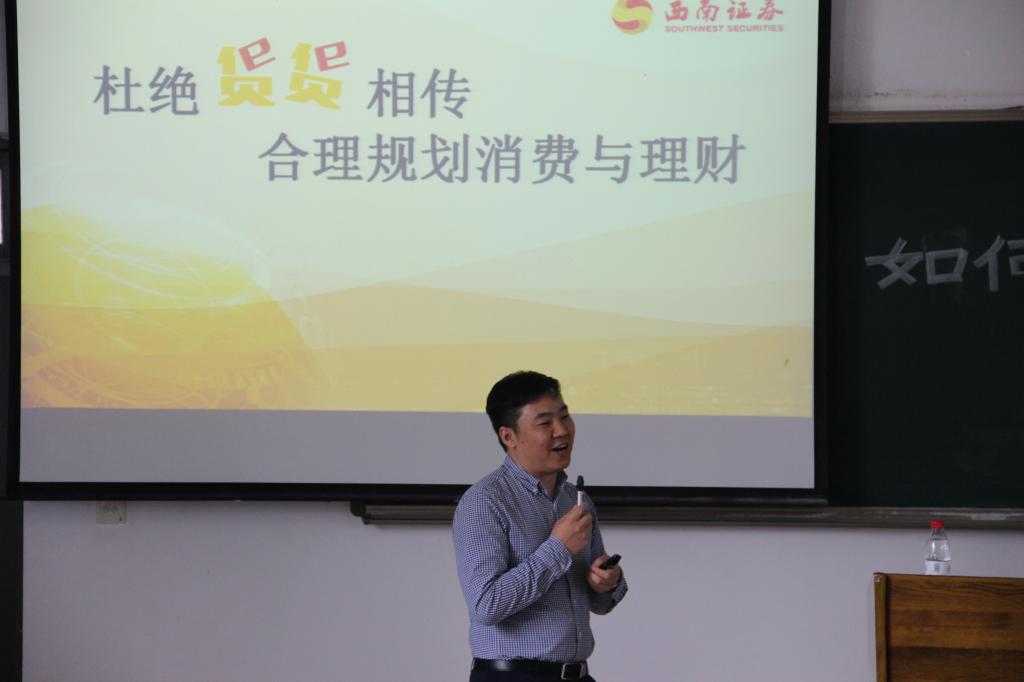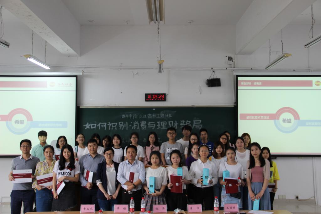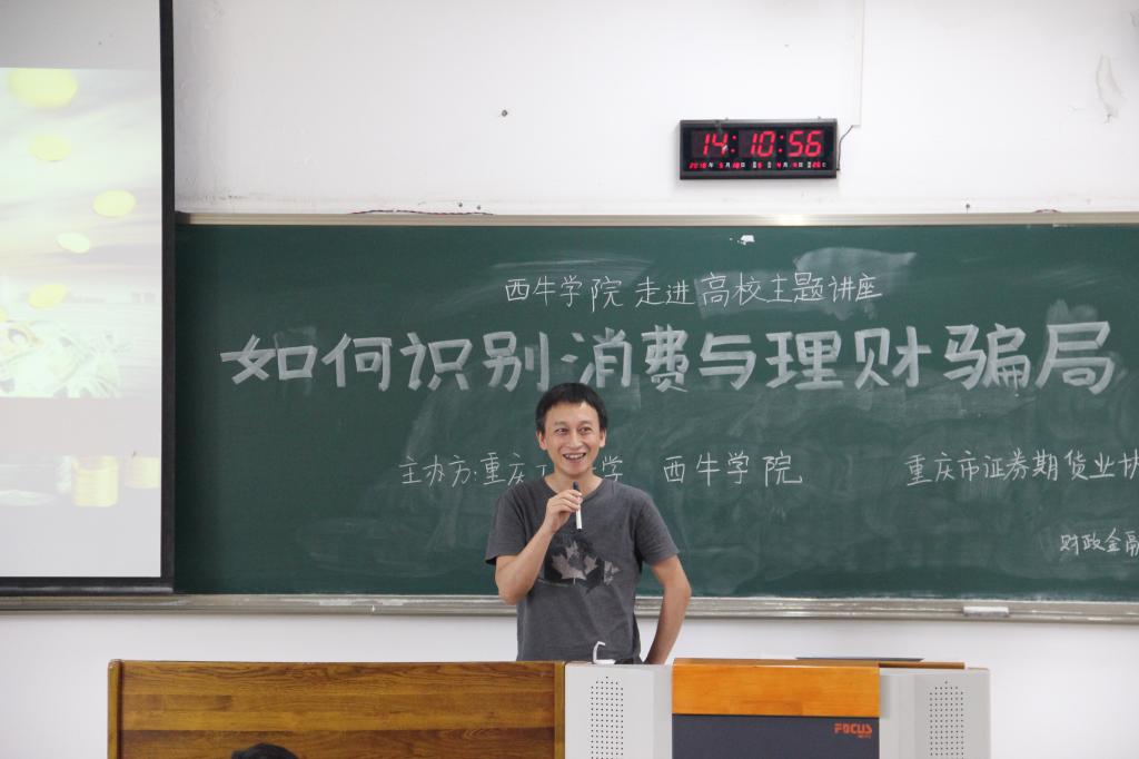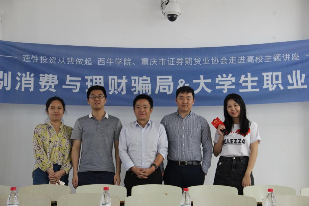 为使大学生了解金融市场风险、提高识别金融骗局的能力,同时为大学生提供就业规划、职业发展的指导与建议,5月18日下午2点,西南证券国家级互联网投教基地“西牛学院”、重庆市证券期货业协会和菲律宾欧博游戏网财政菲律宾欧博游戏网在博智楼207联合举办了“如何识别消费与理财骗局暨大学生职业发展交流”的主题讲座。西南证券财富管理中心副总经理张涛、西南证券财富管理中心产品经理黄立龙、重庆市证券期货业协会培训部主任朱佳、财政菲律宾欧博游戏网分党委副书记黄谦以及学团办主任兰丽娟作为嘉宾莅临了本次讲座。