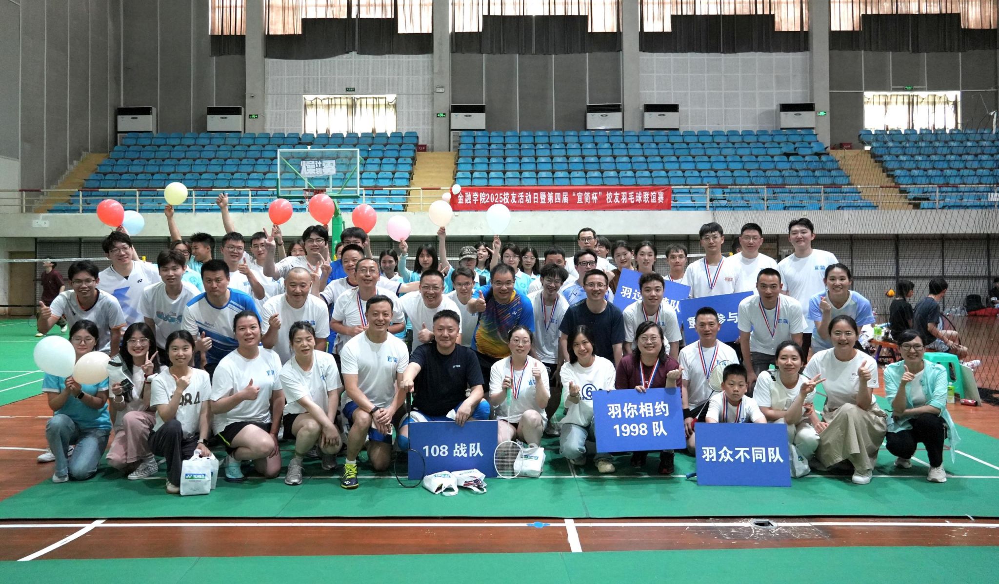 在体艺馆,第四届“宜简杯”校友羽毛球联谊赛精彩纷呈。赛场上,各支队伍展现出不俗的实力,高远球、扣杀等精彩球技频现,参赛队员将顽强拼搏的体育精神与团队协作力拉满。激烈角逐后,赛事奖项依次揭晓:特别奖由“宜简1队”、“宜简2队”、“羽过天晴队”获得;“重在参与队”过关斩将登顶冠军;“羽你相约1998队”荣获亚军;“劳资蜀道山队”荣获季军。“羽众不同队”、“108战队”、“羽林军队”分获四至六名。
