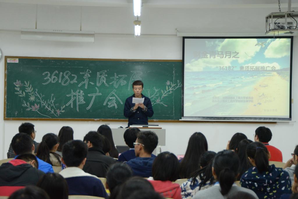 2015年11月5日,财政菲律宾欧博游戏网分团委学生会组织开展了“36182”素质拓展工程推广会,对15级CFA新生进行素质拓展的全面讲解,并邀请了校学生会素拓部部长徐义配,财金学院学生会副主席李超,素拓部部长参加本次素拓推广会。