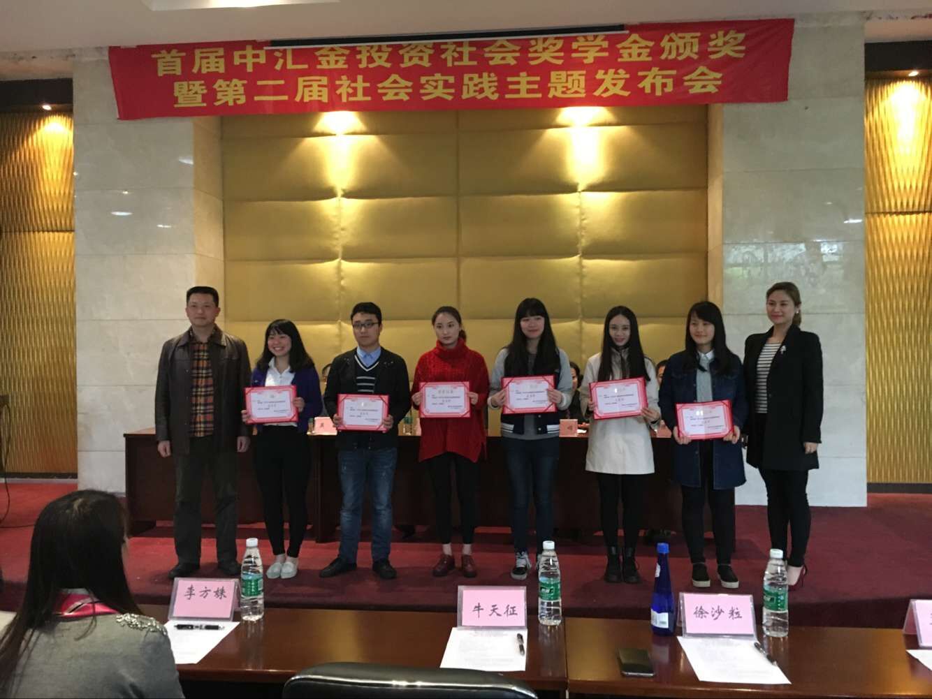 为培养行业后备人才,促进高校将竞赛与学科建设及学生学业和就业需求挂钩,进一步深化校企合作,达到以赛促教,以赛促学的目的。财金学院与中汇金于2015年启动了首届“中汇金”杯大学生社会实践调研活动。参与此次社会实践活动的学生,在中汇金公司专业人士的带领和财金学院专业老师的指导下不断提高自己的社会实践能力和专业技能。财金学院刘书记在致辞中对重庆中汇金投资管理有限公司关心学院学生发展表示感谢,并希望双方能继续加深合作,中汇金投资管理有限公司刘总则肯定了财金学子在社会实践活动中的优异表现。随后,双方为获得一等奖、二等奖和优秀奖的学生颁发荣誉证书和奖学。