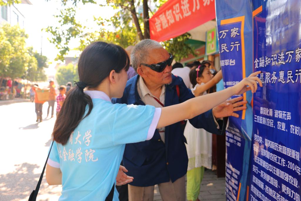 现场分为金融知识宣讲、金融APP游园、金融知识灯谜三个展区,活动形式丰富多样,宣讲内容紧贴民众生活。活动之初,实践团充分考虑到乡民对金融知识的实际接受能力,化繁为简,用通俗易懂的语言讲授防诈骗等各类金融知识。乡民们站在宣传台前咨询相关知识、聚在宣传板前热烈讨论,仔细阅读各宣传册。
