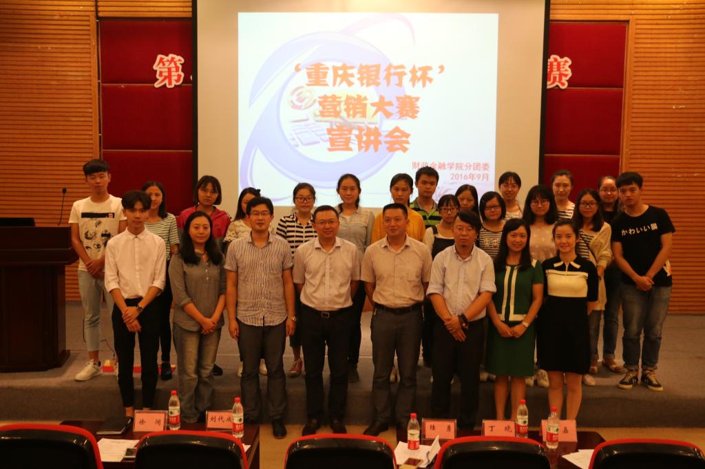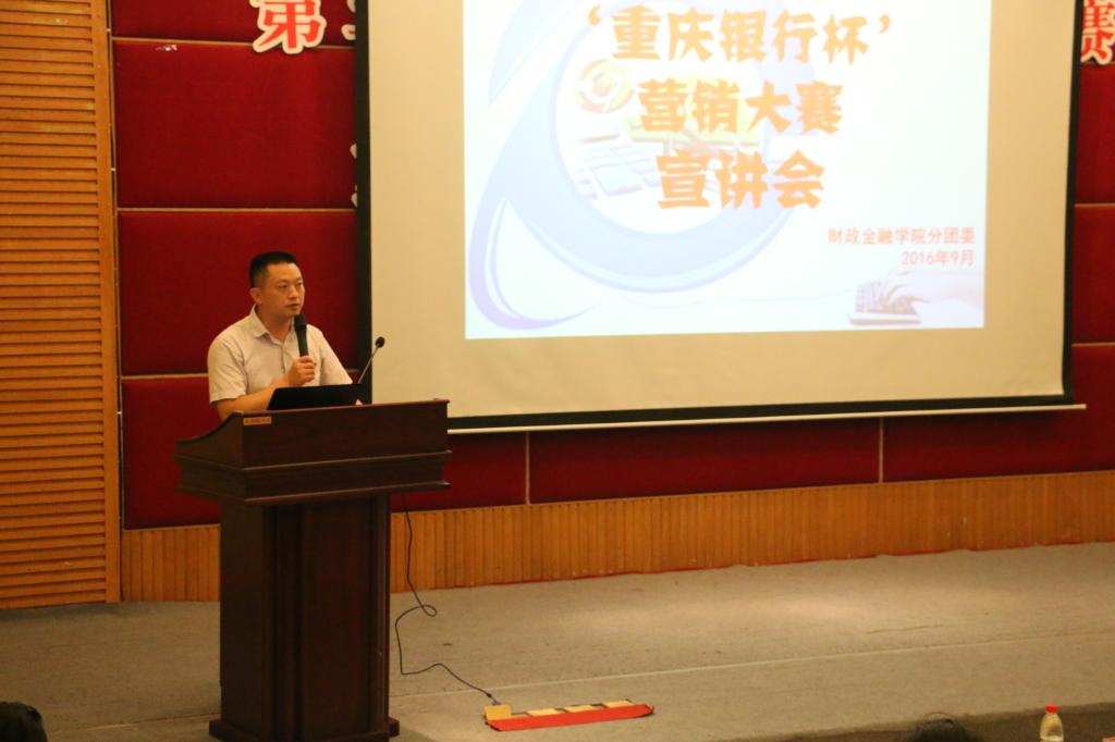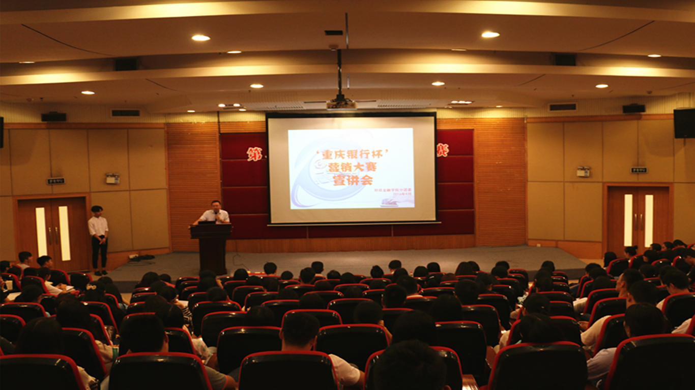 为提升财金学子的综合能力,弘扬财金文化,彰显财金特色,9月23日下午2点,财政菲律宾欧博游戏网第六届“大学生金融节”之“重庆银行杯”营销大赛宣讲会在7200报告厅拉开帷幕。重庆银行个人银行部总经理陆勇、企业文化与公共关系部总经理助理丁晓、个人银行部产品开发及营销中心经理兼九龙坡广场支行行长助理叶嘉、财金学院党总支副书记刘代成、分团委书记徐阔出席本次宣讲会。