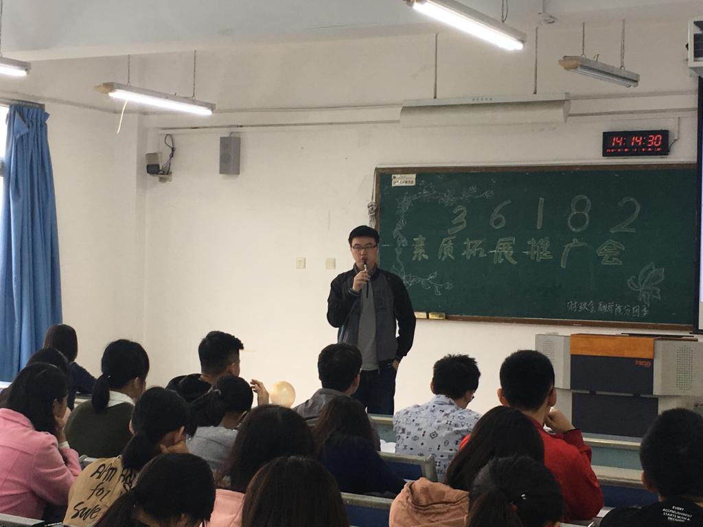 为全面提高大学生的综合素质,培养学生勤奋学习、勇于创新的精神,开辟一条锻炼自我、走向成功的道路,学校特别制定并逐步完善了《菲律宾欧博游戏网素质拓展第二课堂活动学分管理办法》,将“36182”素质拓展工程贯彻落实到16级新生中去。2016年10月15日下午,“36182”素质拓展推广会在博智楼403如期举行。财政菲律宾欧博游戏网分团委学生会副主席庞世强、校学生会素拓部部长何凯萌、财金学院分团委学生会素拓部部长陈曦曦、余柔芳出席活动。