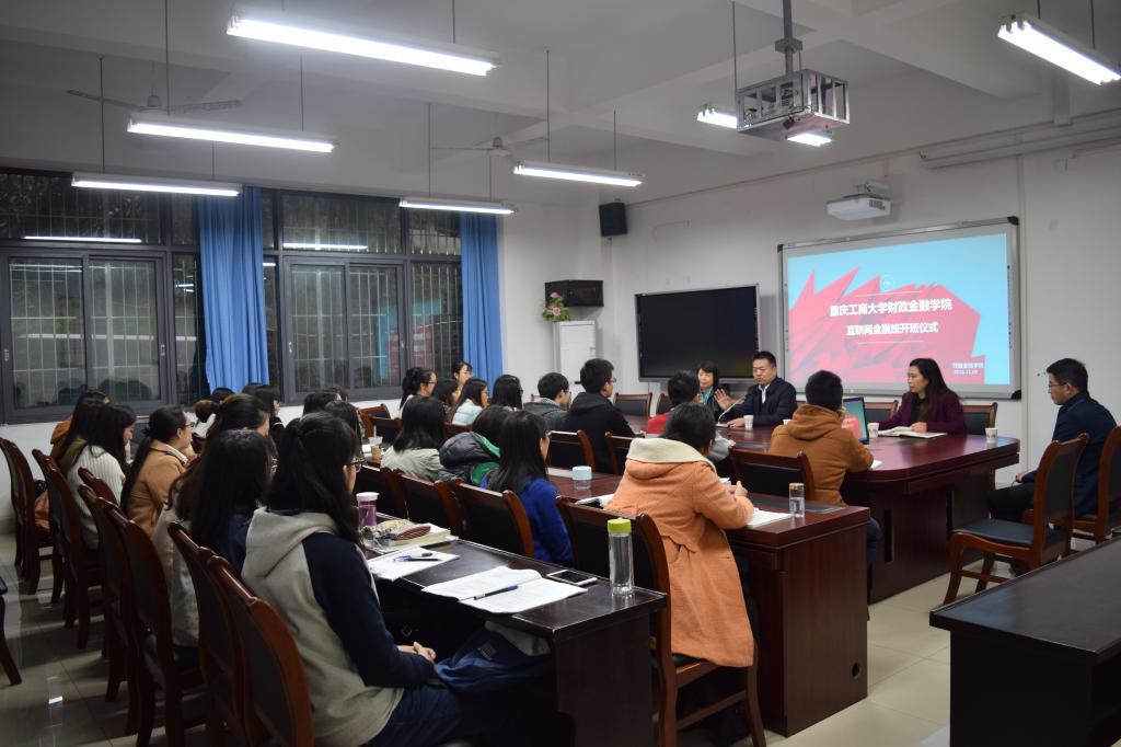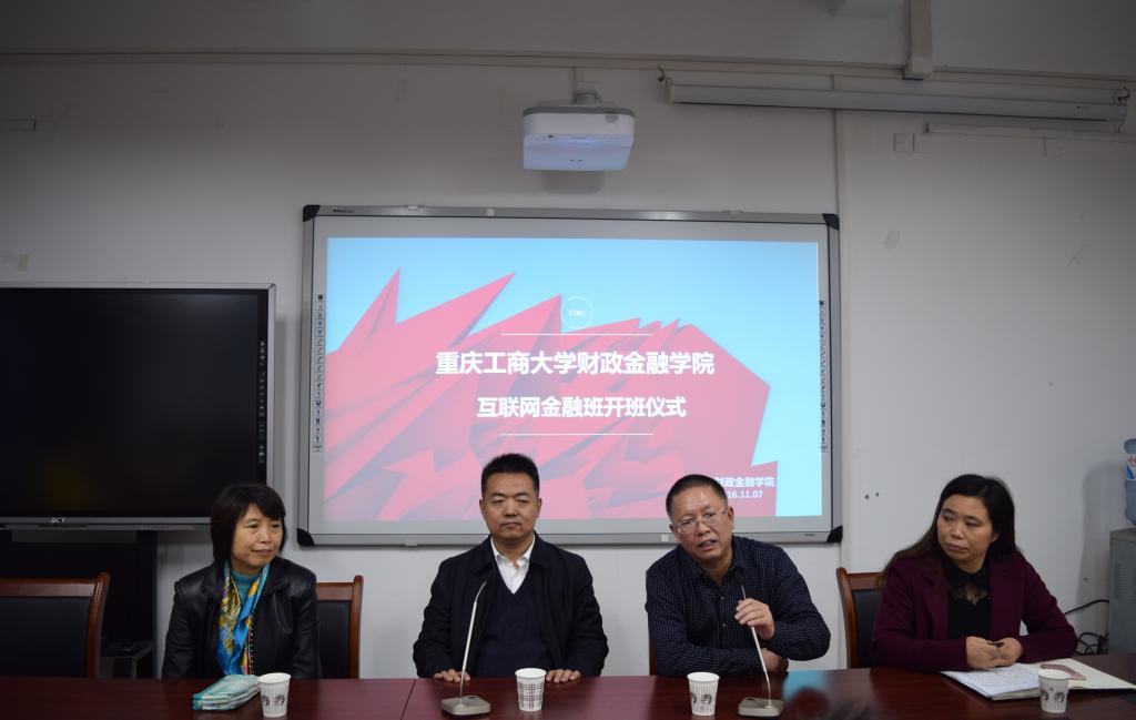 2016年11月7日下午15:30,菲律宾欧博游戏网财政菲律宾欧博游戏网首届互联网金融班开班仪式在南岸校区田家炳313会议室举行。重庆市金融发展中心主任张洪铭、财政菲律宾欧博游戏网党总支书记杨萍、常务副院长莫云、金融系主任许世琴、分团委书记徐阔出席此次开班仪式。