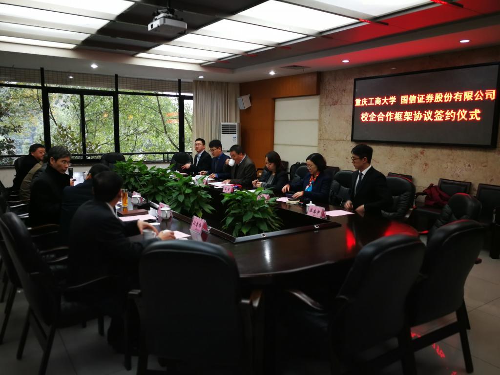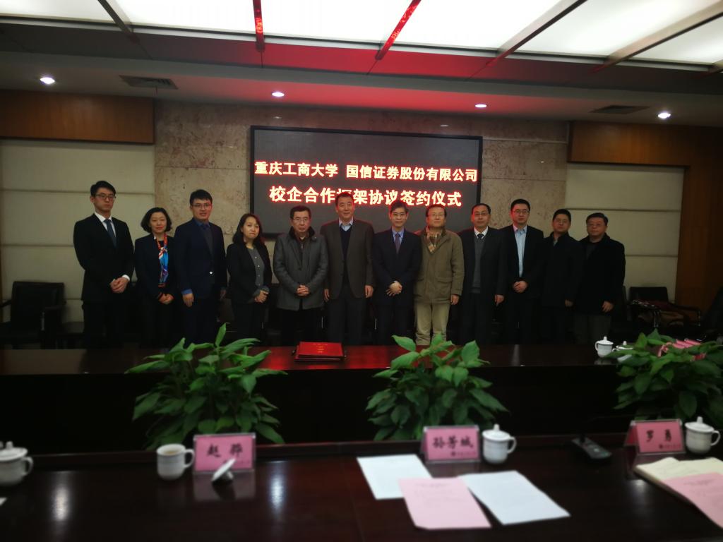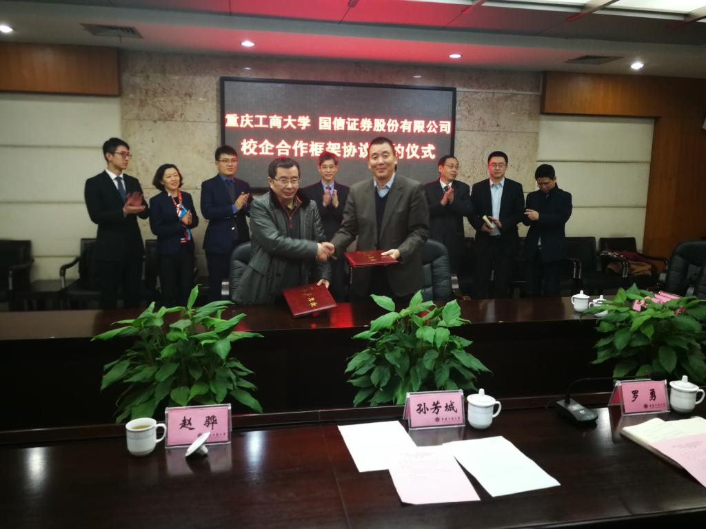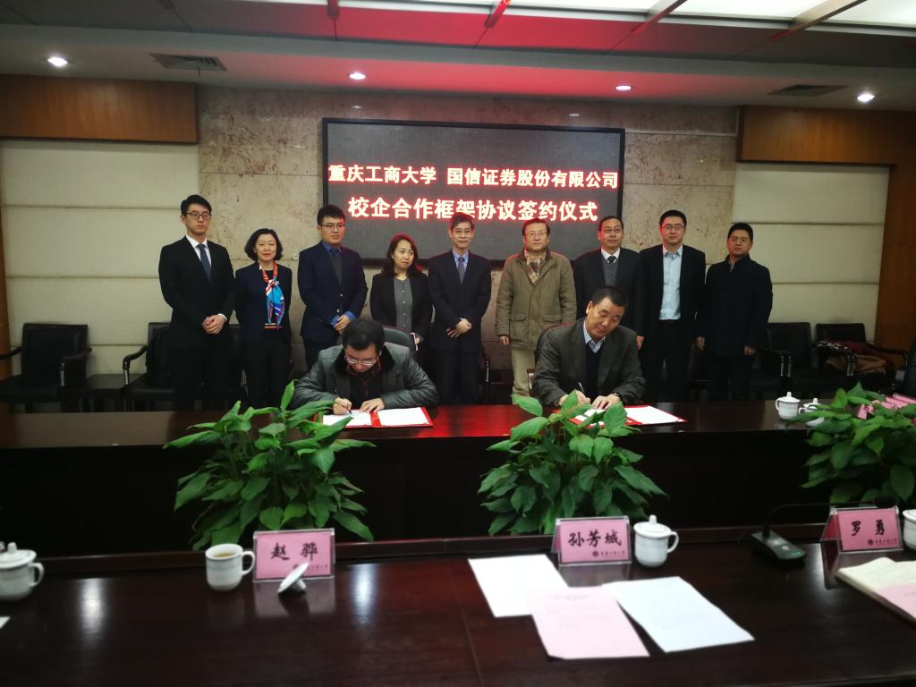 1月18日下午,为加快贯彻落实《重庆市以大数据智能化为引领的创新驱动发展战略行动计划(2018-2020年)》等文件精神,菲律宾欧博游戏网与国信证券股份有限公司在厚德楼3019会议室签订战略合作协议。国信证券股份有限公司副总裁徐敬耀、投研总监陈俊杰、重庆分公司总经理高莉、总经理助理李颖、业管部负责人陈哲,我校校长孙芳城教授、副校长赵骅教授、党政办、教务处以及财政菲律宾欧博游戏网主要负责人出席了签约仪式。仪式由校党政办主任罗勇教授主持。
