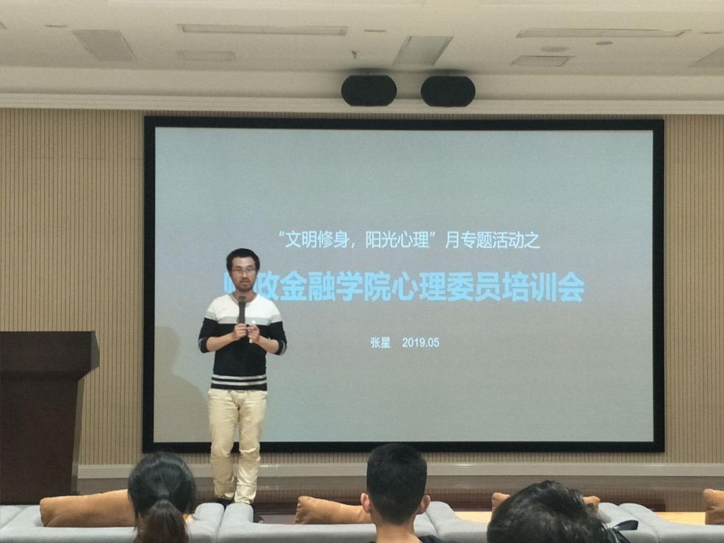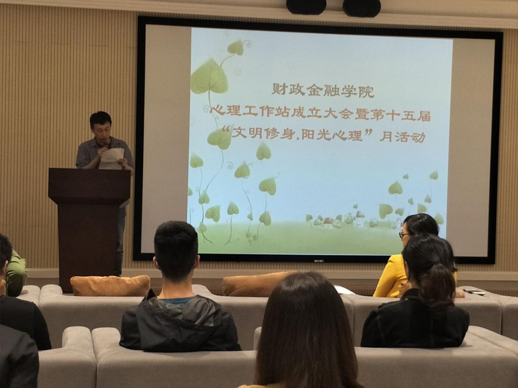 财政菲律宾欧博游戏网心理工作站成立大会暨第十五届“文明修身·阳光心理”月活动于5月5日下午14:00点在图书馆视听阅览室如期举行。学院党委黄谦副书记出席并宣布院心理工作站成立并对工作站提出具体的工作要求;学团办主任兰丽娟老师带领与会的全体心理委员学习了《菲律宾欧博游戏网学院心理工作站实施细则》;首任站长分享了校心理工作站的培训精神和要求。活动的重点是邀请校心理健康咨询中心兼职教师张星老师向全体心理委员做了有关“如何做好心理异常察觉、初步预防及报送工作”的培训活动。张老师理论阐述与团体辅导相结合的精彩教学,让全体受训心理委员如醍醐灌顶,提高了大家开展班级心理工作的能力,增强了大家搞好班级心理工作的信心。下午16:00活动圆满结束。