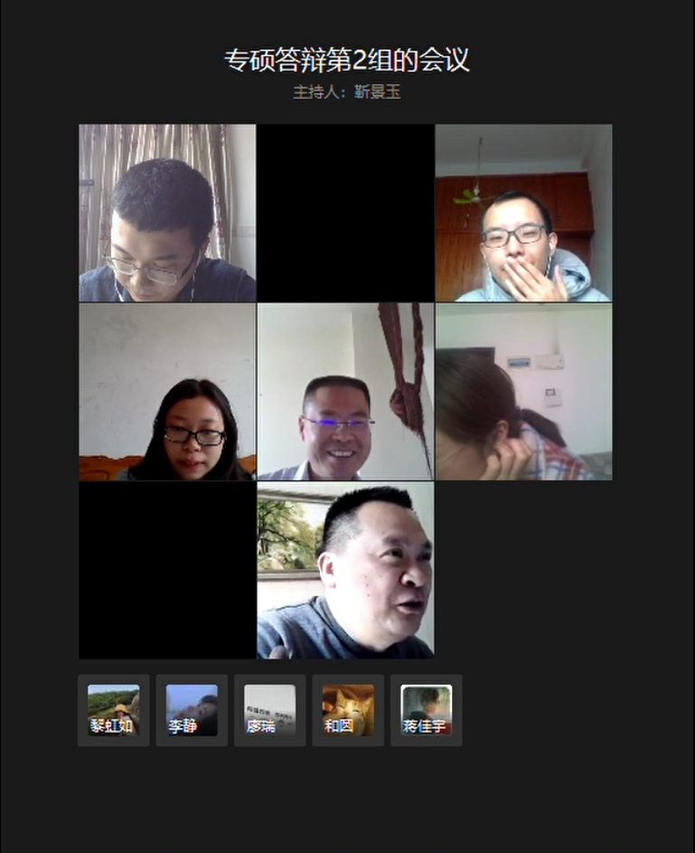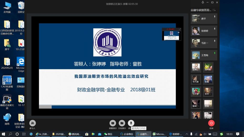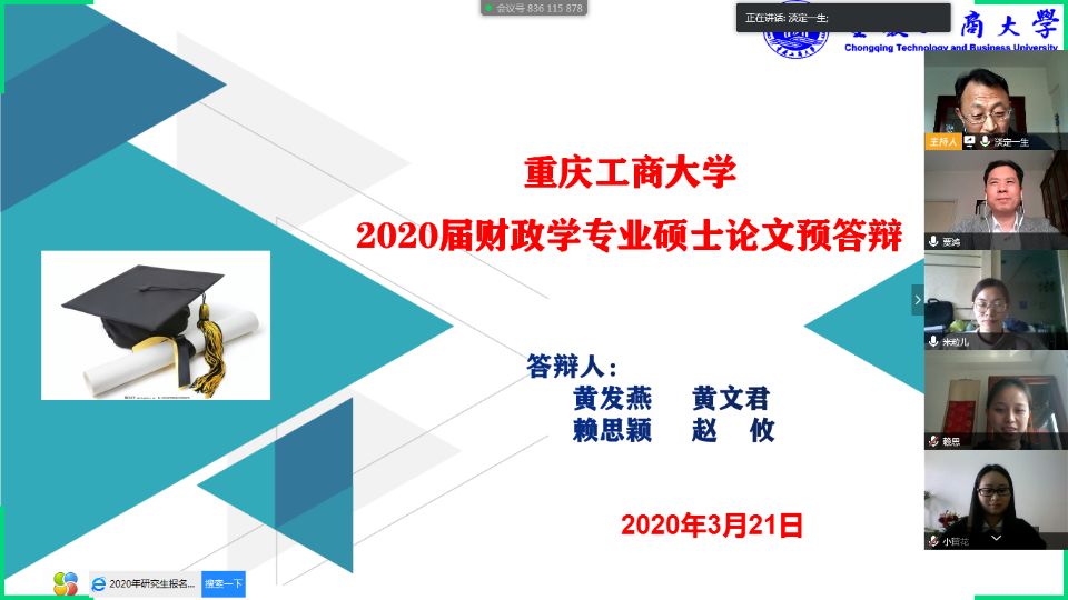 本次预答辩设财政学(1组)、金融学硕(2组),金融专硕(6组),共9组答辩会场,在岗在校的所有硕士生导师都参与了本次预答辩。财政学组由尚可文导师主持,金融学硕组由谭湘渝和骆志芳导师主持,金融专硕组由毛跃一、靳景玉、曾胜、许世琴、王兰和文传浩等6名导师主持。为保障线上预答辩的顺利进行,答辩学生认真准备预答辩报告PPT,答辩专家提前则2天审阅了学生提交的论文电子版并整理出了论文相关评阅意见,同时指定好每组的联络人,为正式预答辩做好准备工作。