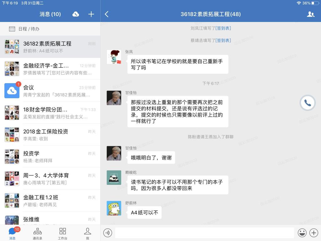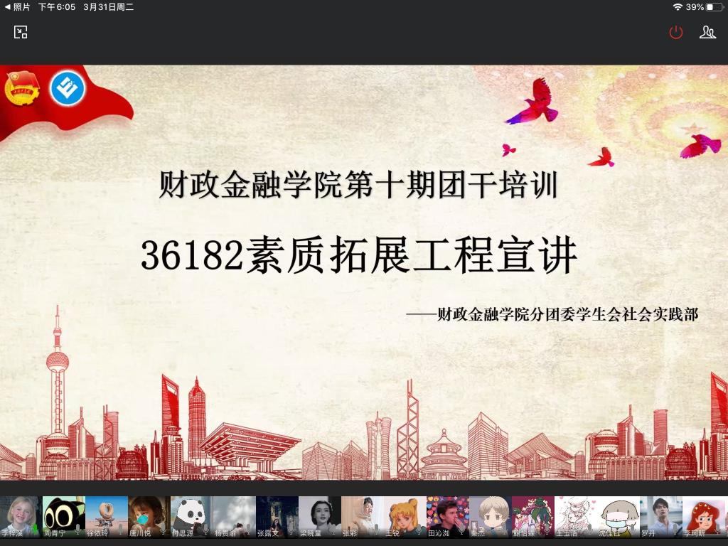受疫情影响,财政菲律宾欧博游戏网于2020年3月31日在企业微信线上平台成功开展主题为“36182素质拓展工程宣讲”的第十期团干培训活动。本次活动由财政菲律宾欧博游戏网分团委学生会副主席李梓溪主持,16、17、18级各班以及19CFA的团支书参与培训。