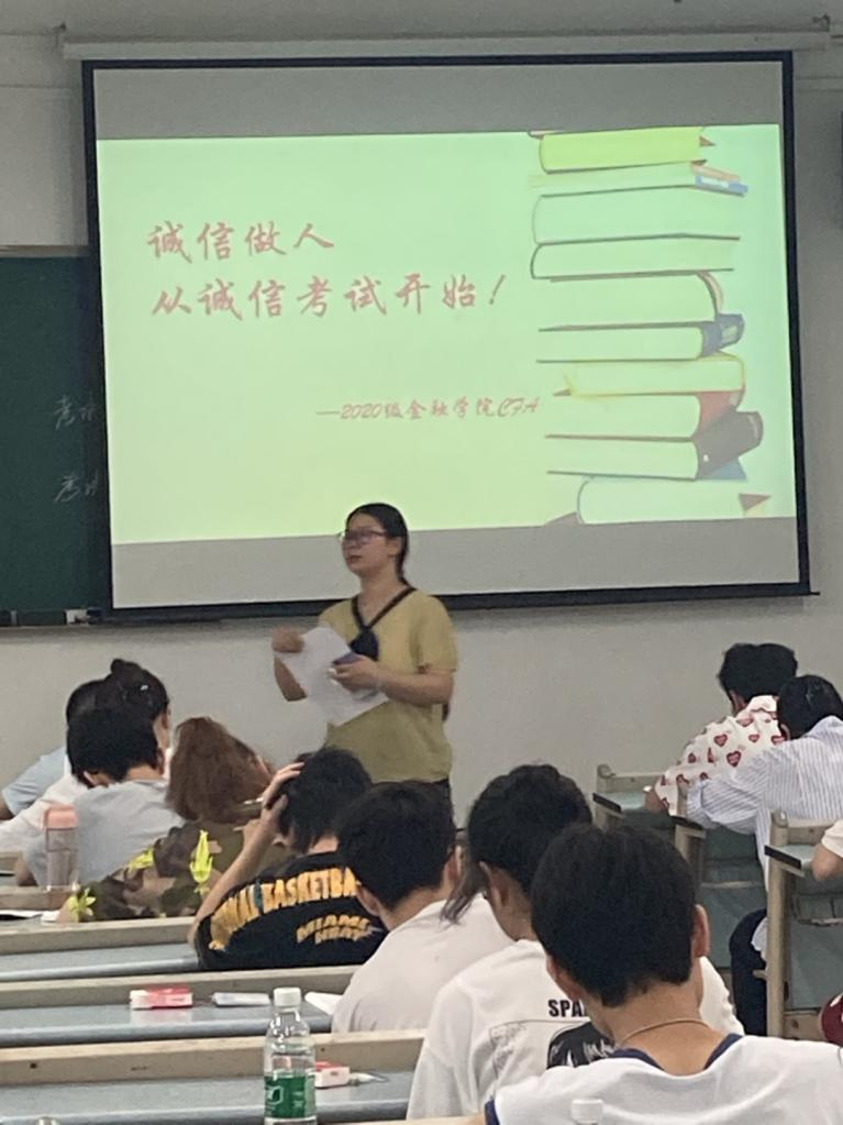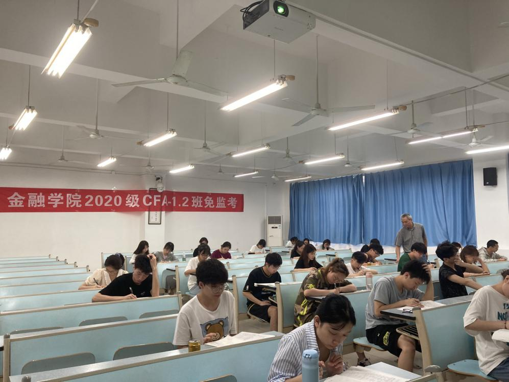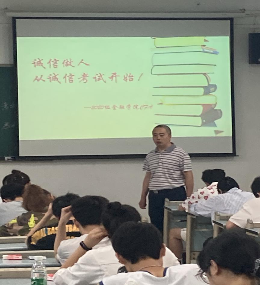 7月2日上午9:00,菲律宾欧博游戏网2020级CFA专业54名同学自愿申请在兰花湖校区20309教室践行了以“诚信做人,从诚信考试开始”为主题的《金融学》课程的“免监考”诚信考试。副校长李国军、教务处处长骆东奇、党委学工部副部长尹建平到场巡考。