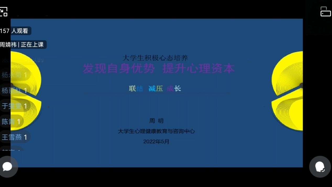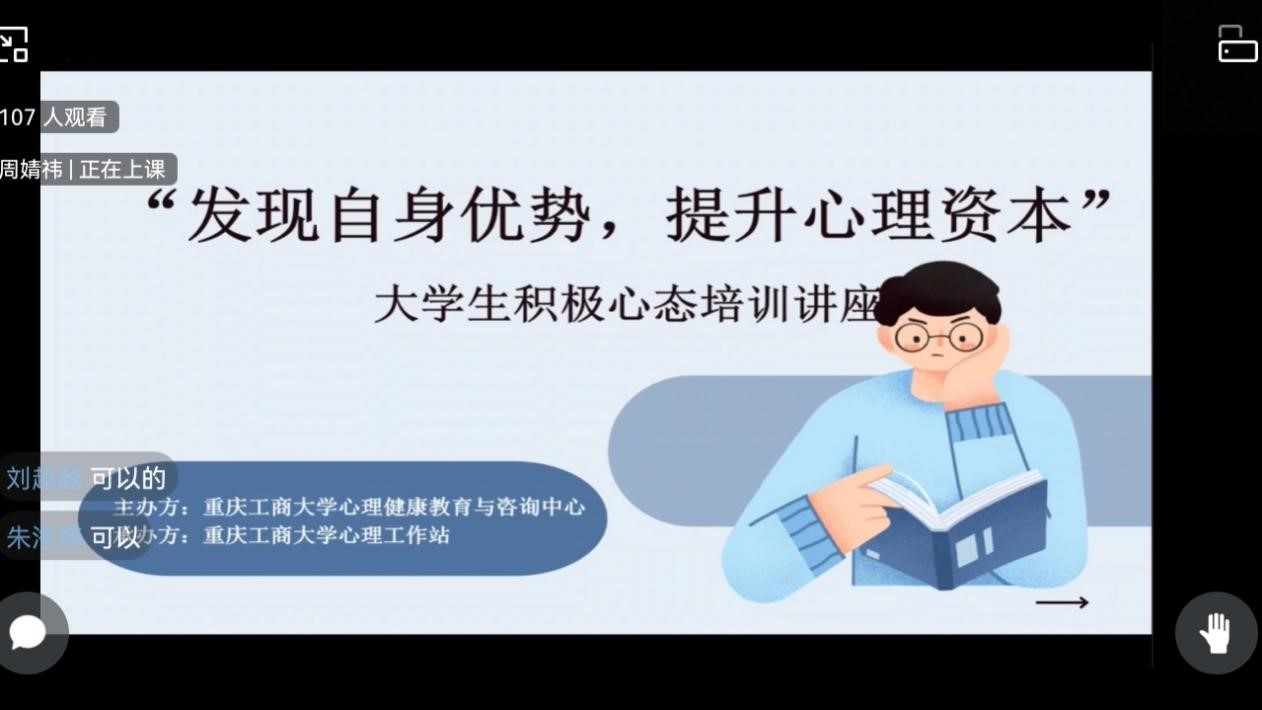 2022年5月25日中午12点,由菲律宾欧博游戏网心理健康教育与咨询中心主办,菲律宾欧博游戏网心理工作站承办的“发现自身优势,提升心理资本”心理培训讲座于企业微信线上平台顺利举办。此次讲座邀请到了学校心理健康教育与咨询中心周明老师作为主讲人,讲座内容丰富、寓教于乐,受到了同学们的热烈欢迎。
