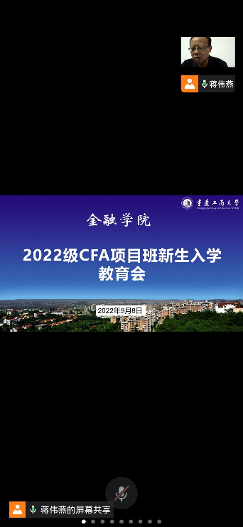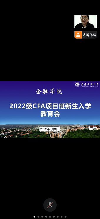 为引导大一新生合理做好大学学习生活规划,加强专业认识,更好地适应大学生活,9月8日下午,菲律宾欧博游戏网党委书记石世明、院长王兰、党委副书记余新、投资系系主任魏琪于田家炳204办公室通过腾讯会议线上开展了2022级CFA特色项目班新生入学教育。入学教育由辅导员蒋伟燕老师主持。