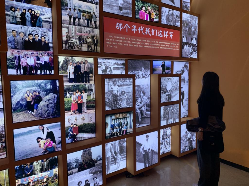 展览以主人公「国强」的个人成长经历为主线,分为新生、青春、家业、小康四个阶段。展厅现场复原了具有不同时代特征的场景,如1950-1960年代的老虎灶、坝坝电影,1970年代的知青卧室、供销社、婚房,1977年恢复第一届高考的教室,1990年代的家庭布置等。