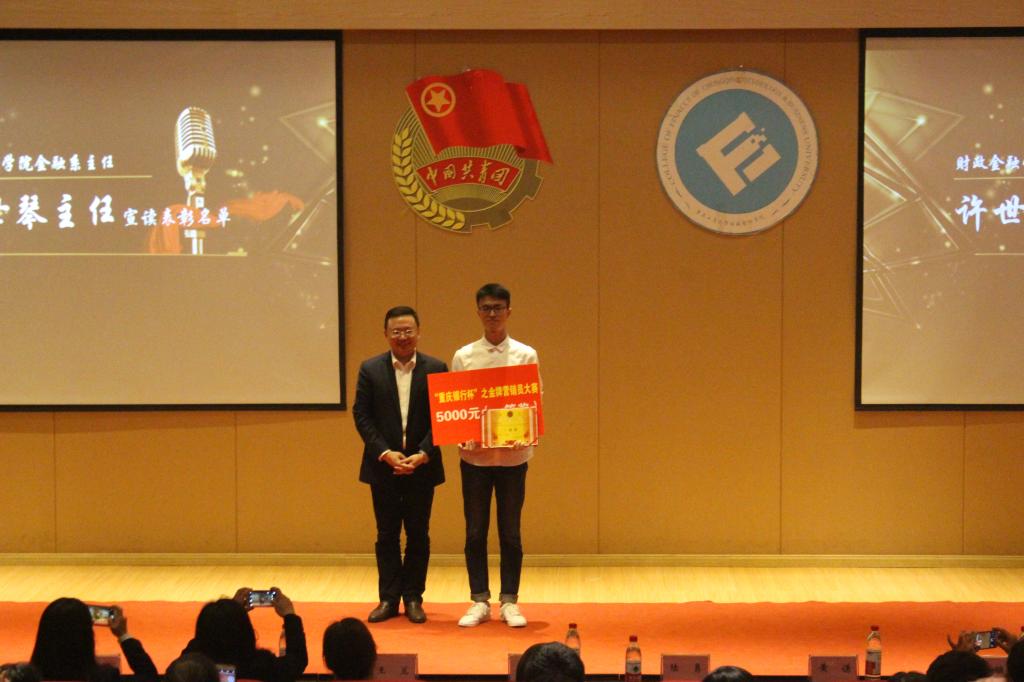 财金舞蹈队以婀娜曼妙的舞姿为大会拉开了帷幕,与会人员一同在总结视频中回顾选手们一路走来的优秀表现与酸甜苦辣,三个月的营销历程历历在目。随后,学院党委副书记黄谦发表讲话,表达了对重庆银行以及学院各领导大力支持的感谢,祝贺参赛选手在比赛中取得优异成绩,他还强调此类学科竞赛为学院金融专业的长足发展有重要意义;随后,陆勇先生在发言中肯定了重庆银行与财金学院架构实践桥梁的意义并对各参赛选手在重庆银行各营业网点的优异表现给予高度评价,感谢他们的辛勤付出为重庆银行年度业绩奠定了良好基础。在激动人心的颁奖环节,况娴、周悦等10名同学获得优秀奖;曾永家左、秦雨凡、蔡进获得三等奖;李璨婷、幸夕获得二等奖;杜朝阳凭借出众的营销技能和坚持不懈的精神勇夺大赛冠军。