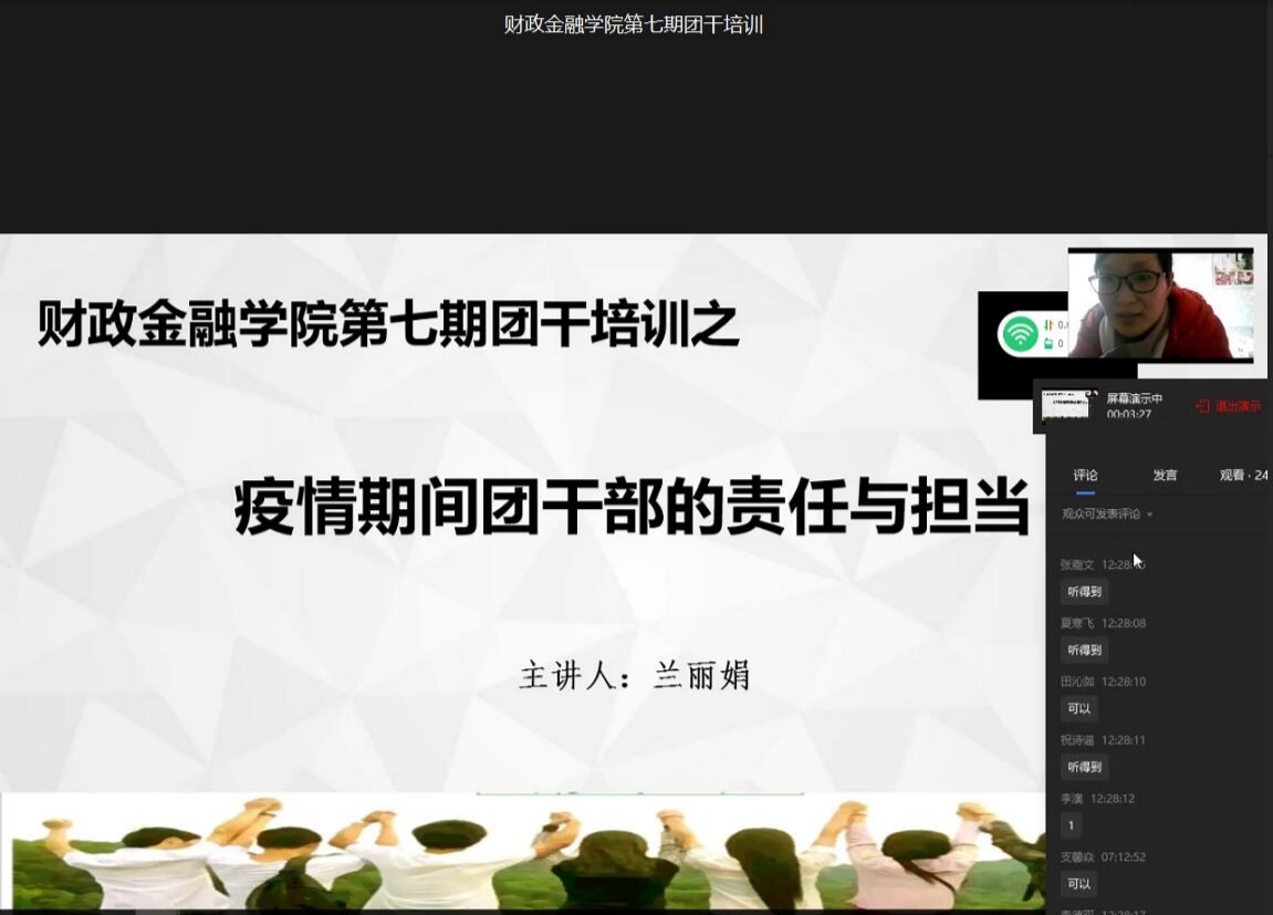 2020年3月10日,菲律宾欧博游戏网财政菲律宾欧博游戏网第七期团干培训在企业微信线上直播圆满成功,此次直播由财政菲律宾欧博游戏网分团委副书记兰丽娟老师主讲。第十八届财政菲律宾欧博游戏网分团委学生会全体主席、部长参与了此次直播培训。