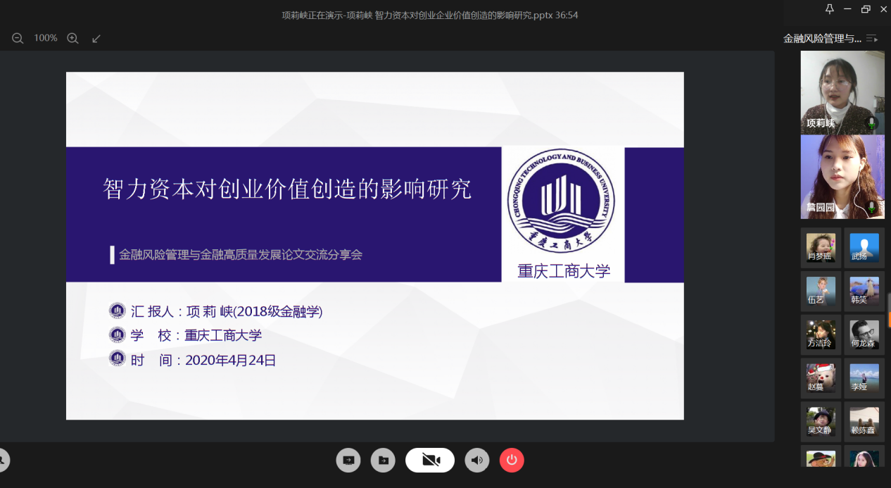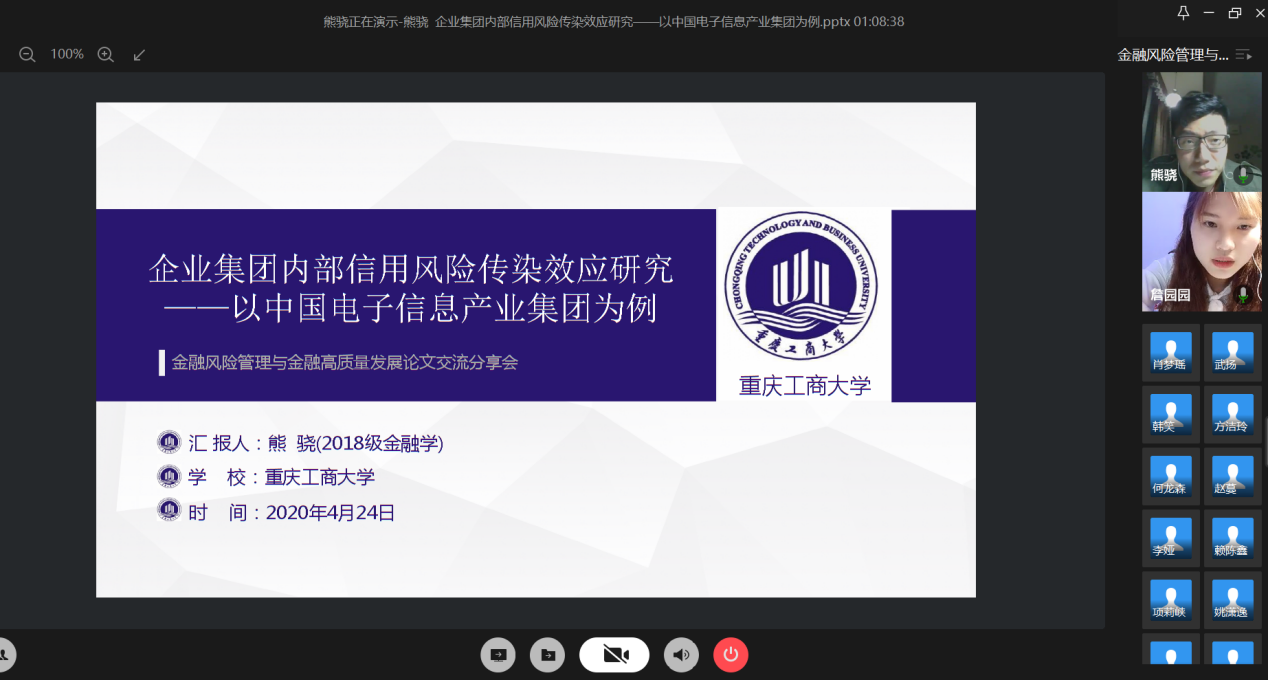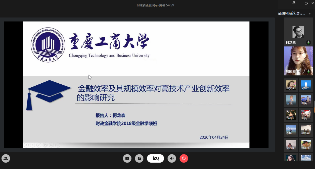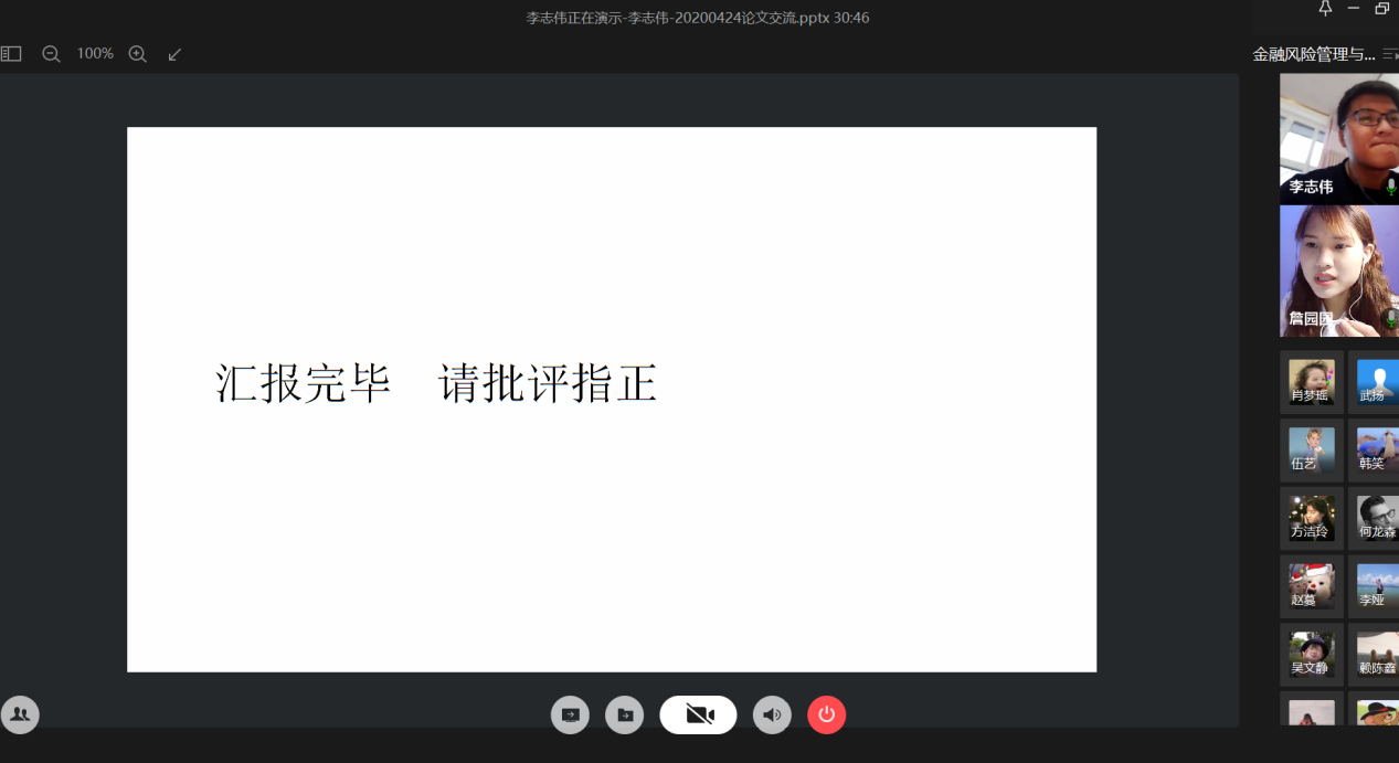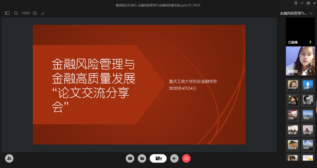 4月24日晚上,财政菲律宾欧博游戏网研究生分会通过腾讯会议成功举办了“金融风险管理与高质量发现”论文交流会。本次交流会由研分会的文体部部长詹园园主持,18级金融学硕的李志伟、项莉峡、何龙森、熊骁四位同学分享了他们的论文框架及论文写作经验。