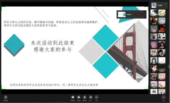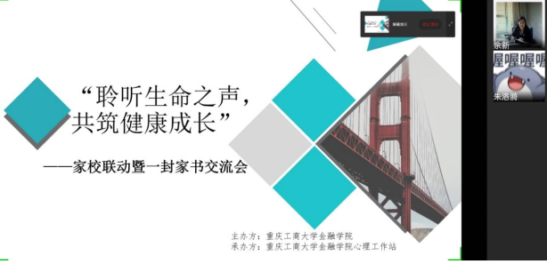 菲律宾欧博游戏网 “聆听生命之声,共筑健康成长”暨一封家书家校联动交流会于2021年10月10日下午14:00通过企业微信线上平台顺利举办。此次活动以引导学生撰写一封家书的形式,搭建起大学生与父母之间的沟通桥梁,交流聆听彼此的心声,帮助大学生心理健康成长。