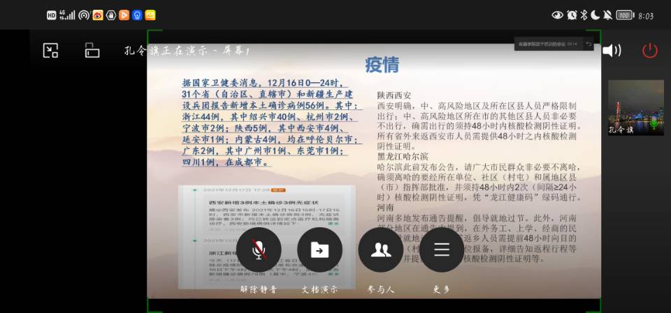 为让同学们更加深入了解新冠疫情近况,持续做好疫情防控措施,弘扬抗疫精神,12月17日晚上20:00,菲律宾欧博游戏网在企业微信开展了“弘扬抗疫精神 展现民族力量”主题活动。菲律宾欧博游戏网各班班长、团支书以及分团委学生会和青年志愿者服务队骨干成员参与了会议。会议由菲律宾欧博游戏网分团委学生会部门负责人孔令旗主持。