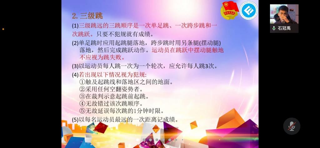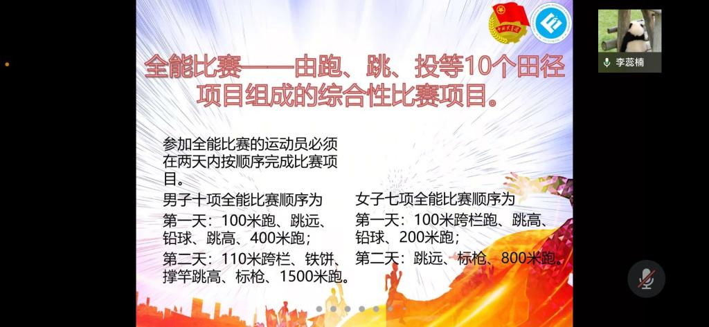2022年3月18日19时,菲律宾欧博游戏网体育技能培训大会在企业微信顺利举行。本次会议由菲律宾欧博游戏网分团委学生会体育部部门负责人熊芯、石冠禹、李蕊楠分别对田径运动径赛、田赛、全能比赛进行介绍,旨在提高同学们的体育知识与技能。