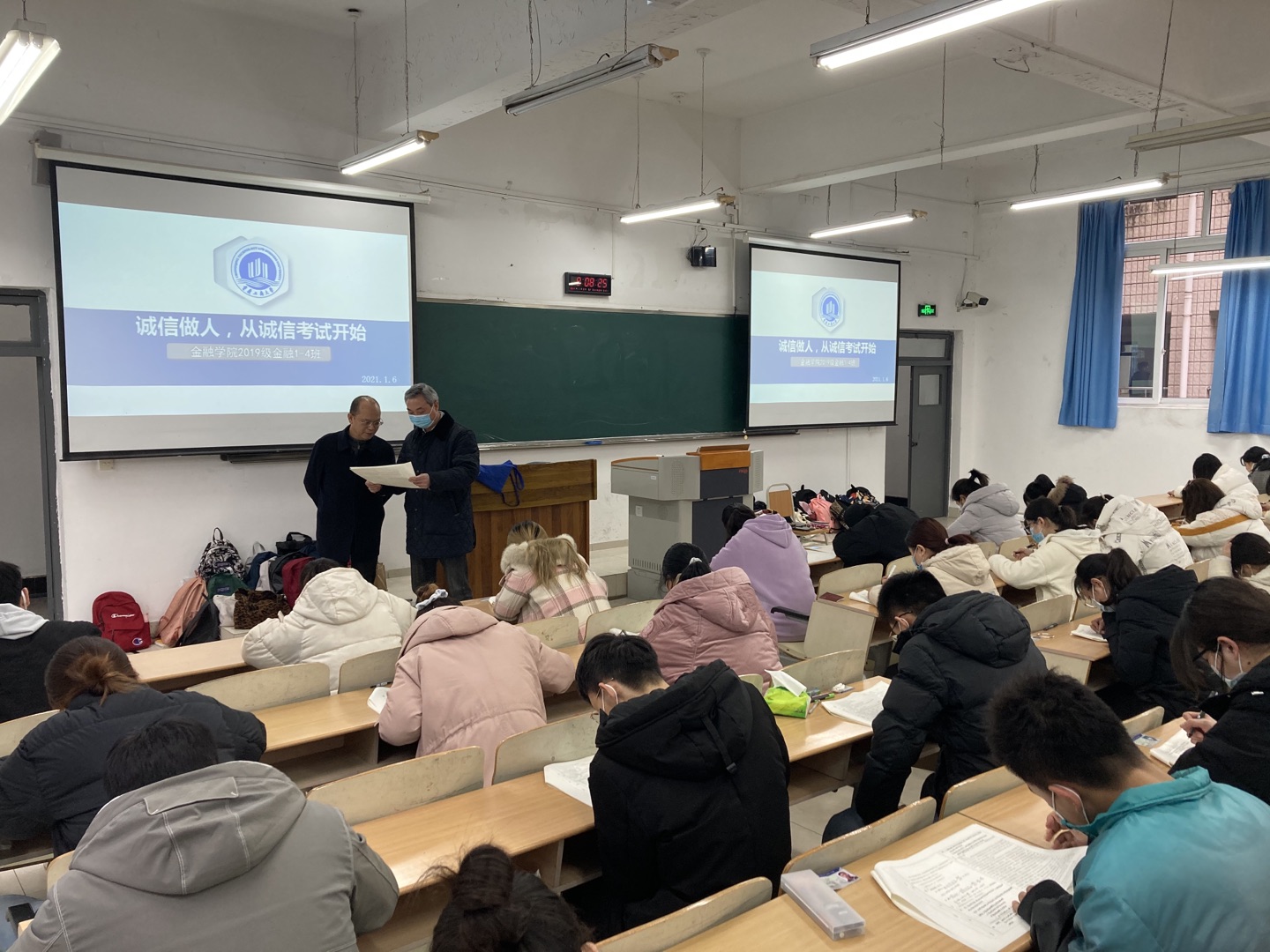 为培养具有“新儒商”精神的新时代大学生,践行“诚信做人,从诚信考试开始”的誓言,2021年1月6日菲律宾欧博游戏网2019级金融学专业共计159名学生自愿申请在博智楼07207和07208教室举行《金融学》课程的“免监考”诚信考试,这是菲律宾欧博游戏网首次举行的“免监考”诚信考试,副校长李国军教授、校长助理谭松涛教授前来巡考。