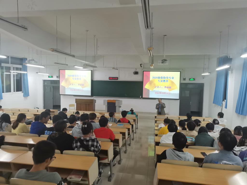 为了进一步适应金融学大类招生和二年级分流培养的新形势,增强学生对专业的认同感,菲律宾欧博游戏网在各专业有序开展专业指导工作。2021年10月14日,保险学系主任谭湘渝教授为2020级保险学专业本科生进行了专业教育。