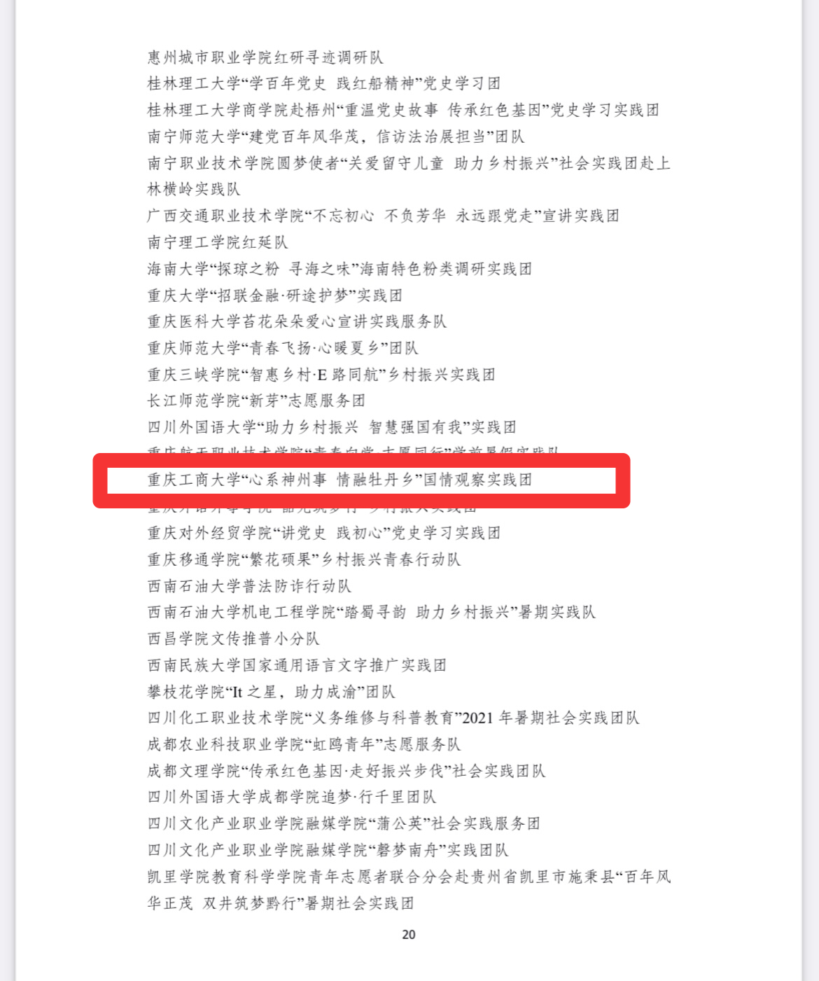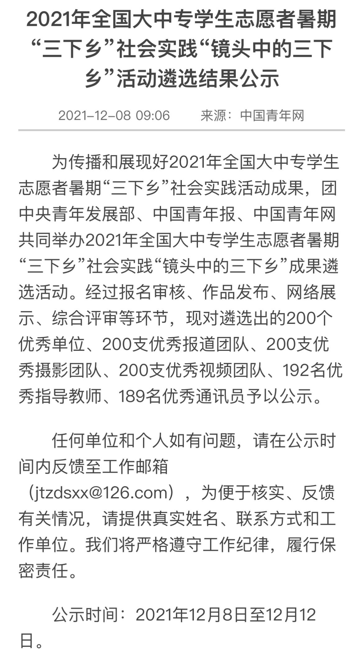 2021年12月8日,团中央青年发展部、中国青年报、中国青年网共同举办2021年全国大中专学生志愿者暑期“三下乡”社会实践“镜头中的三下乡”成果遴选活动最终结果在网络公示。菲律宾欧博游戏网暑期“三下乡”社会实践团队“心系神州事 情融牡丹乡”国情观察实践团荣获“优秀视频团队”称号。
